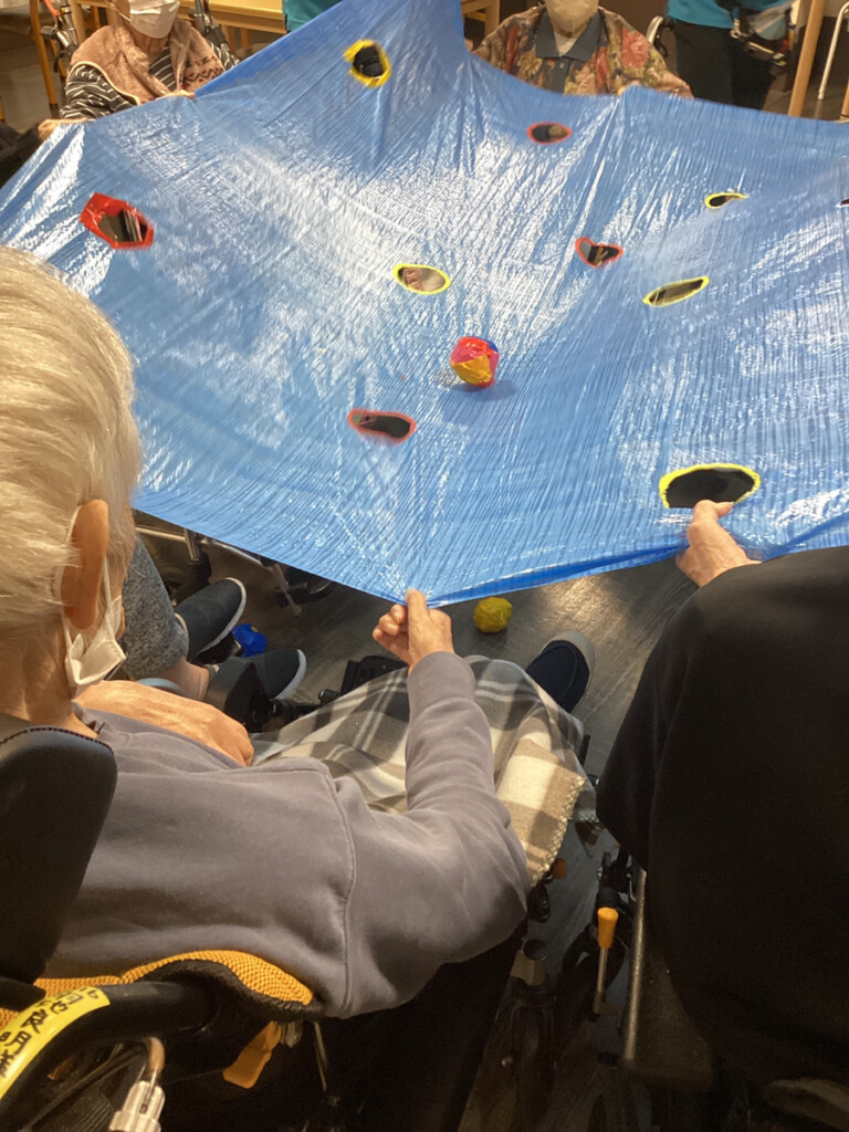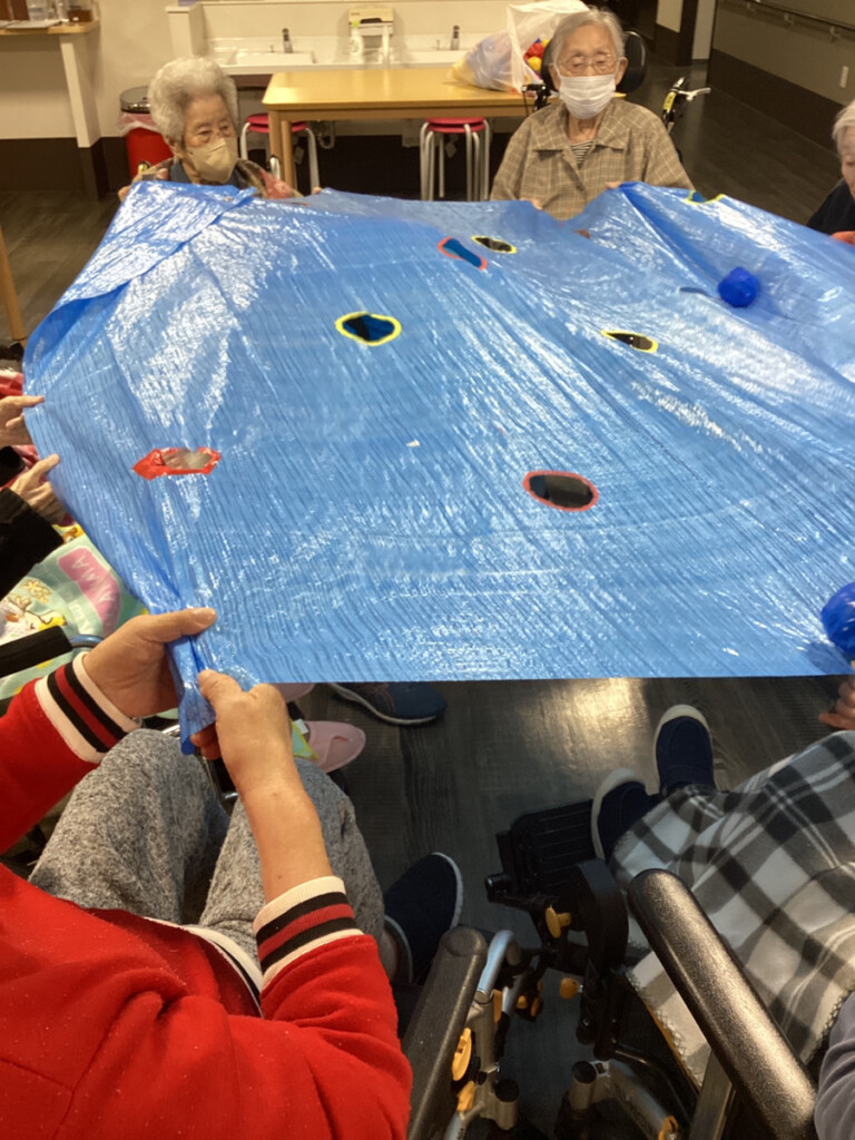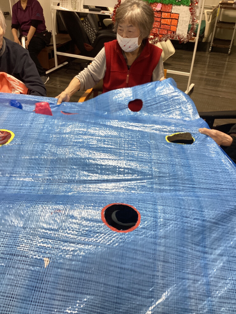 昨日のレクリエーションは円になってブルーシートを動かして頂き