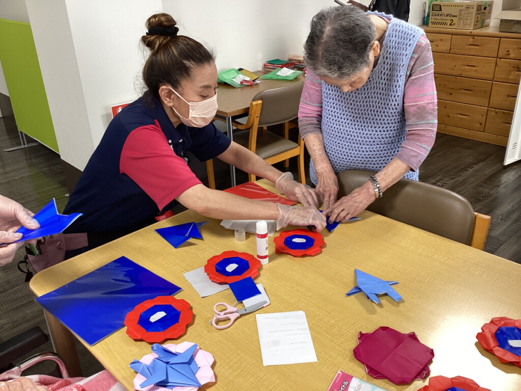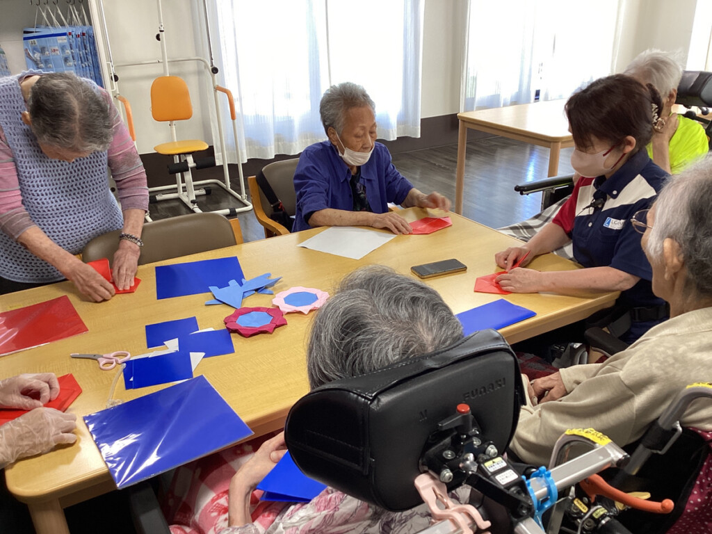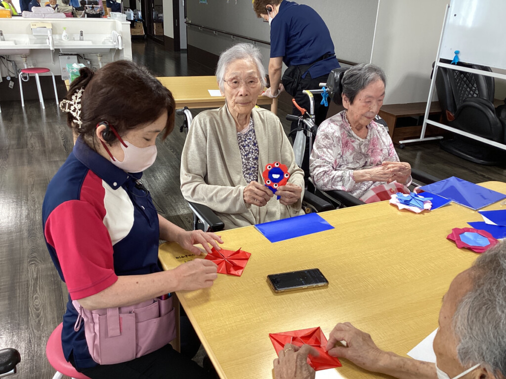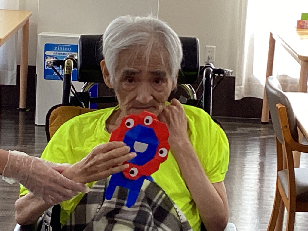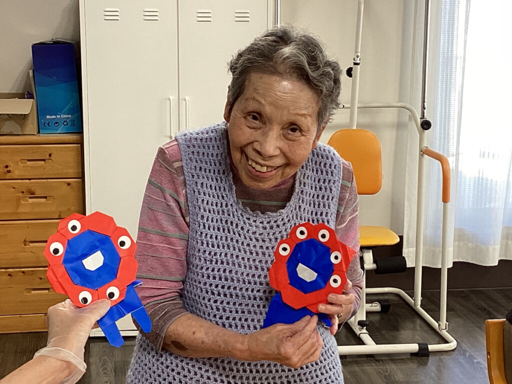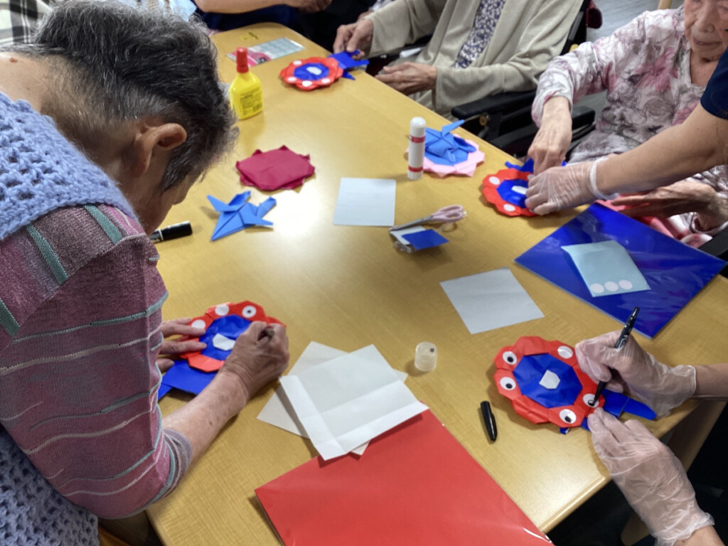 そこで、今回のレクリエーションでは、皆様に今話題になっている大阪・関西万博の人気キャラクターの「ミャクミャク」を折り紙で作っていただきました✨