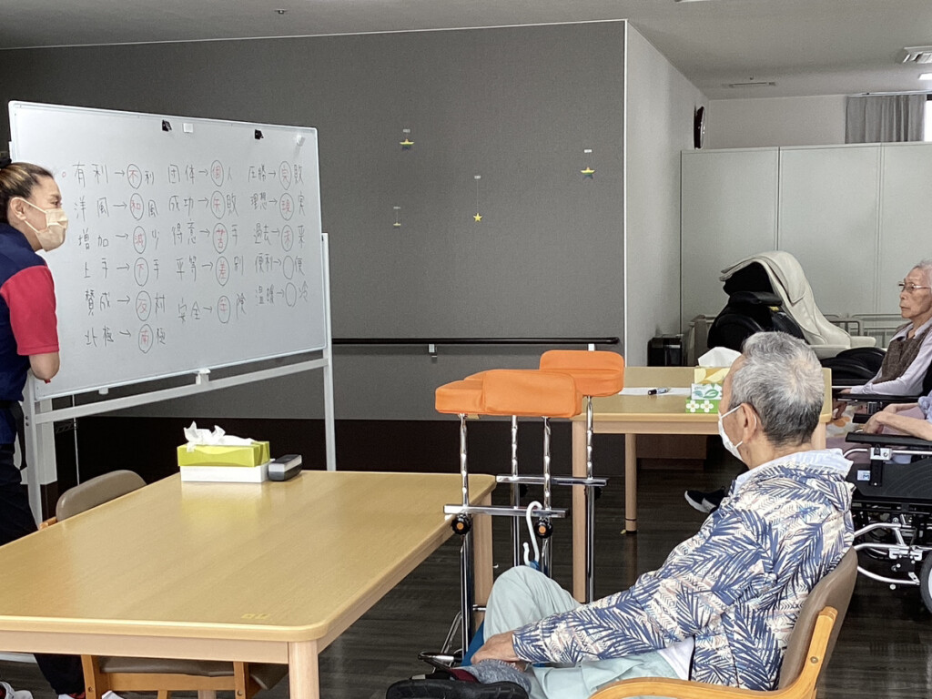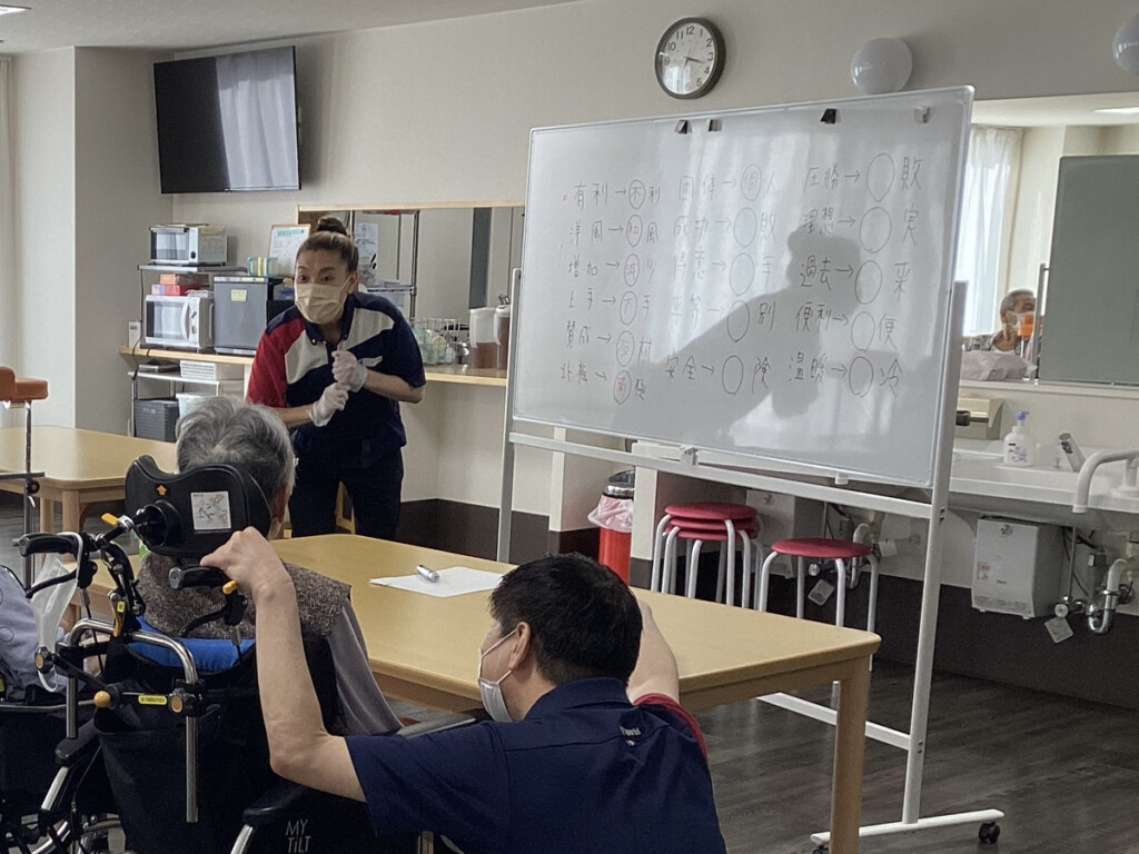 レクリエーションでは言葉遊びとして、反対言葉を当てるゲームをしました♪