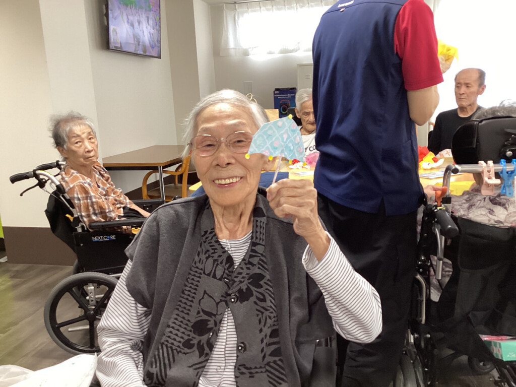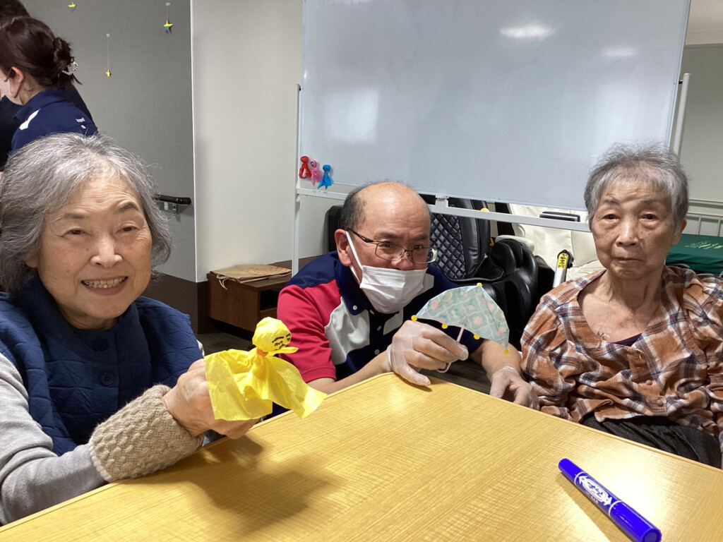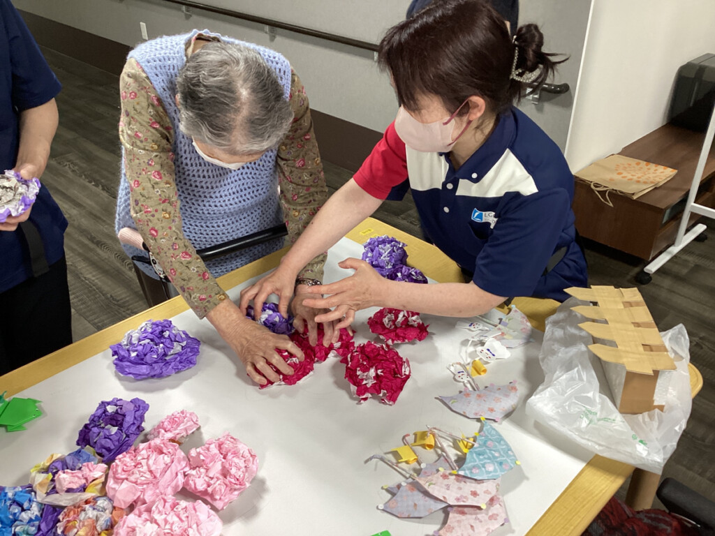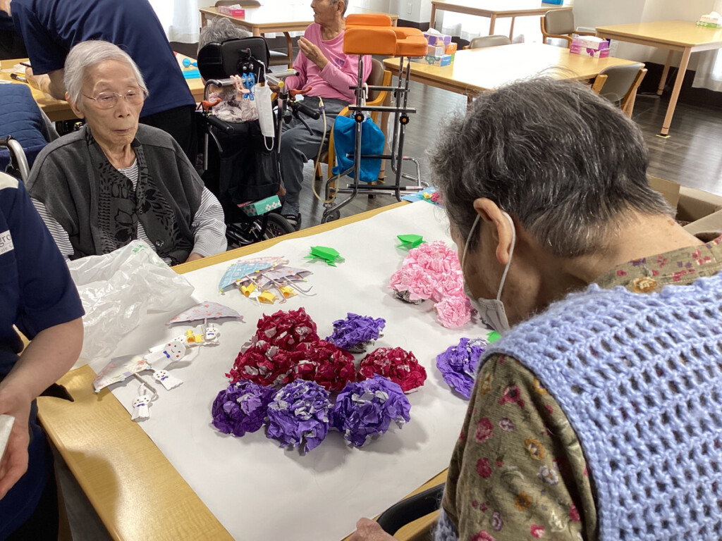本日のレクリエーションでは、紫陽花作りのグループと昨日に引き続きてるてる坊主作りグループと分かれて行いました✨