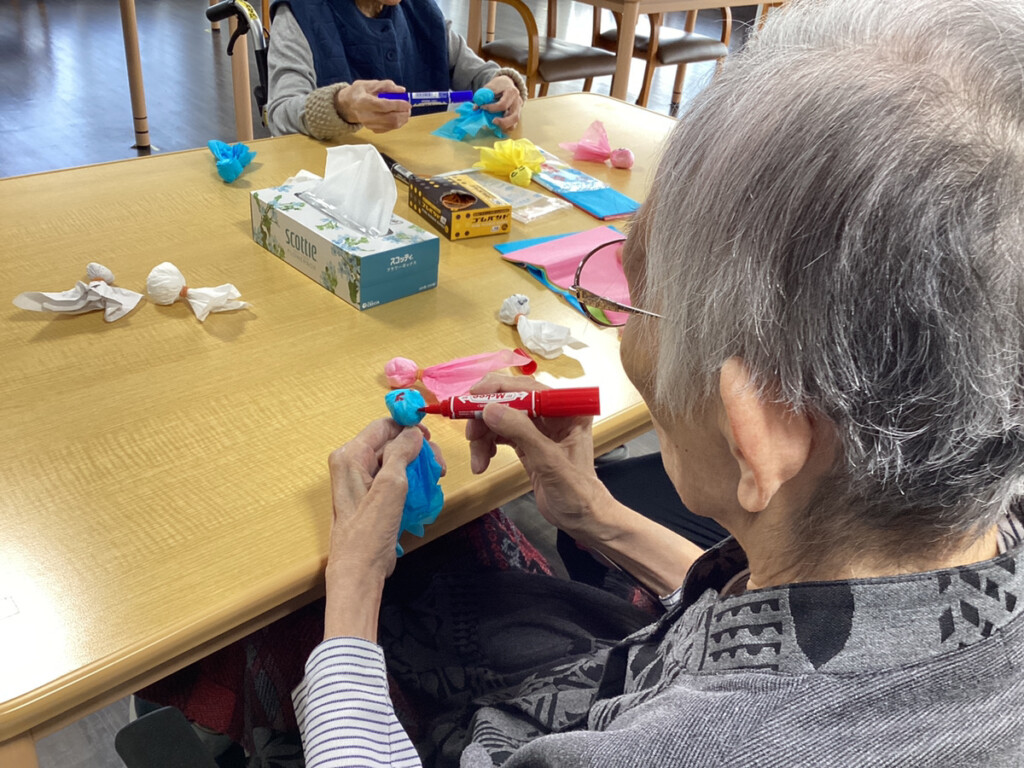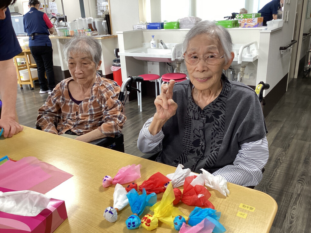そんな梅雨に向けて、晴れの日が多いといいなという気持ちを込めて本日のレクリエーションでは、てるてる坊主を作りました✨