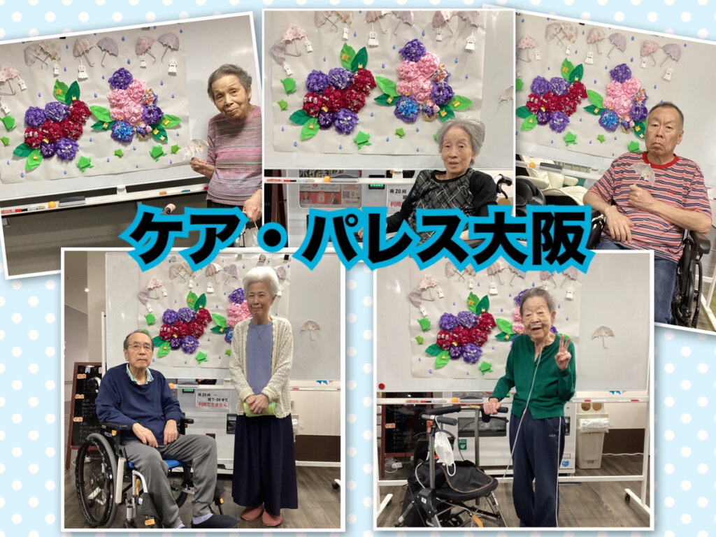 紫陽花作りに加え、カタツムリや葉っぱの作成、てるてる坊主のお顔を書いていただいたり、みなさんで作りました✨