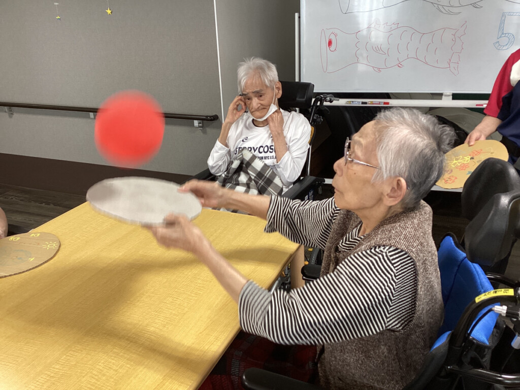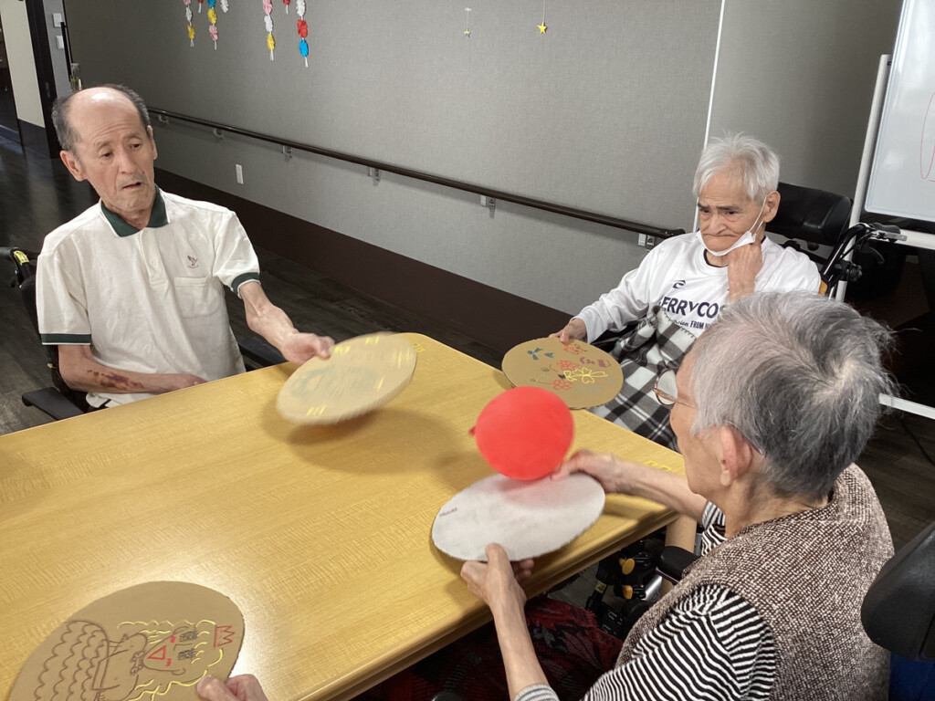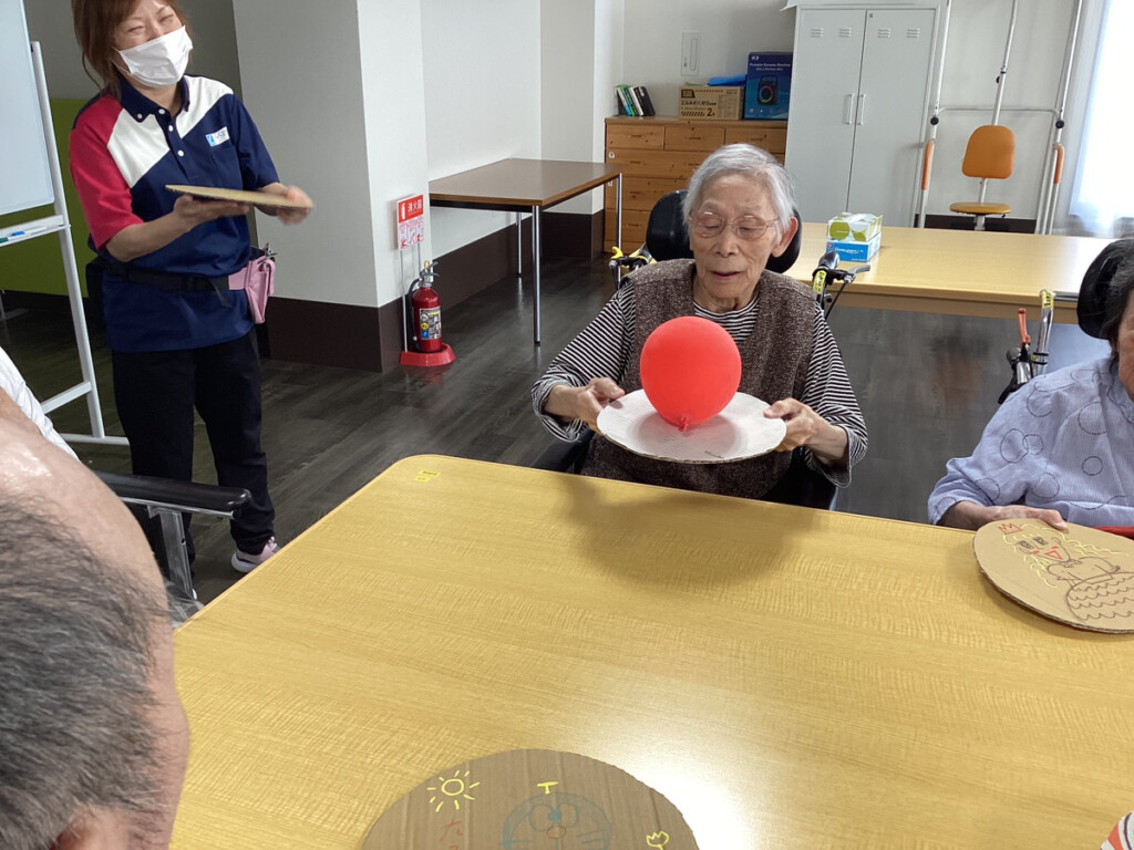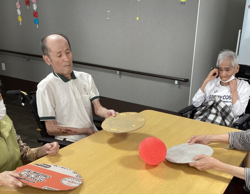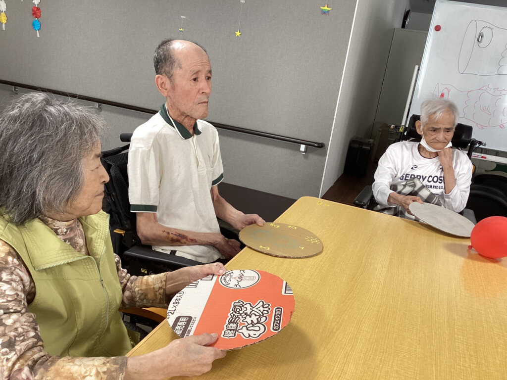 (利用者様が重くないように段ボールを丸く切ったものをラケットにしました。)