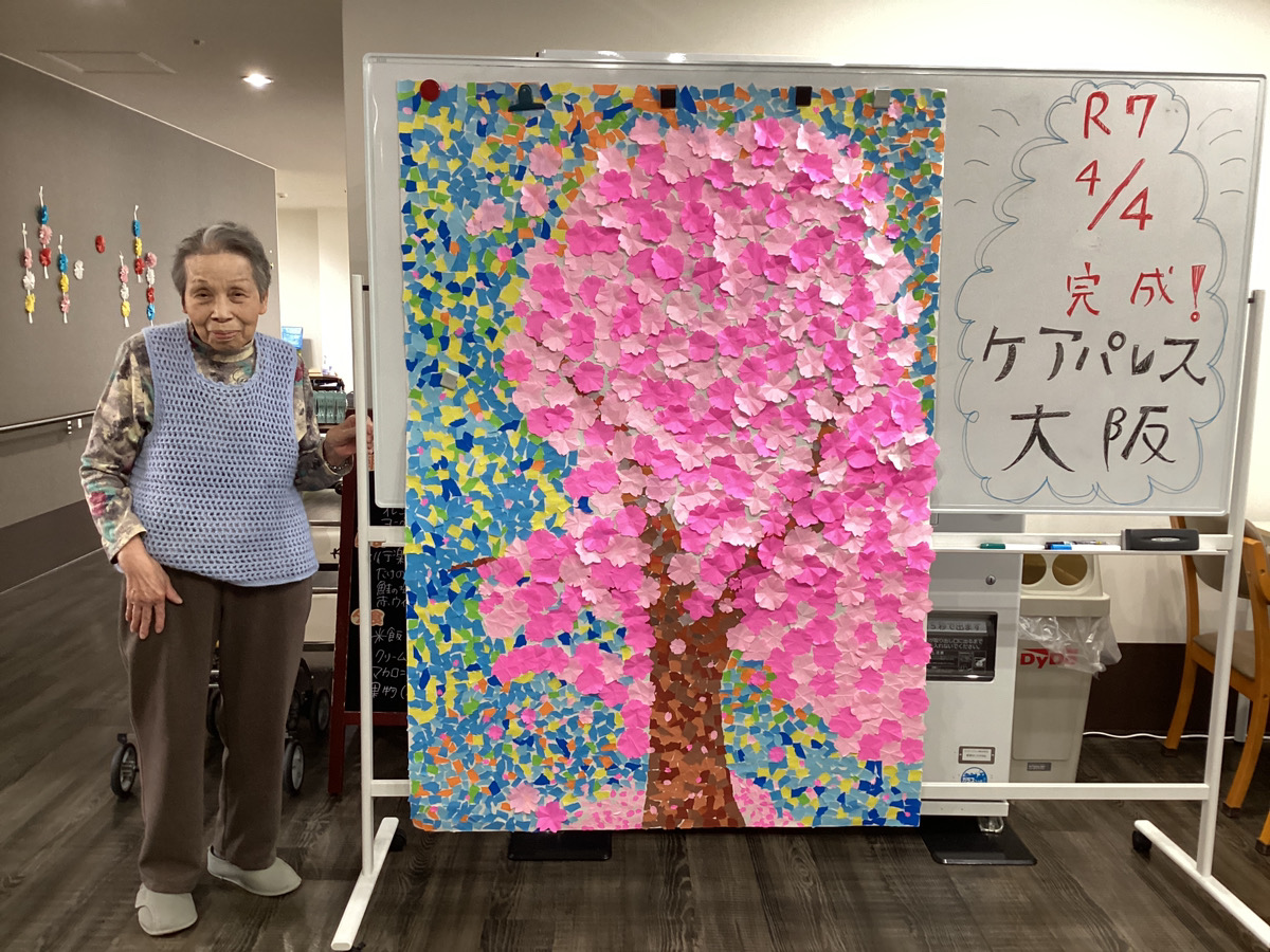 こんにちは、ケア・パレス大阪です。 花見シーズン真っ只中ですね♪ 何度かブログでご紹介させて頂いた桜の木のちぎり絵が完成しました✨ 本日記念写真を撮りました☺ 〒547-0048 大阪市平野区平野馬場1-3-14 サービス付き高齢者向け住宅 ケア・パレス大阪 TEL:06-4303-0707