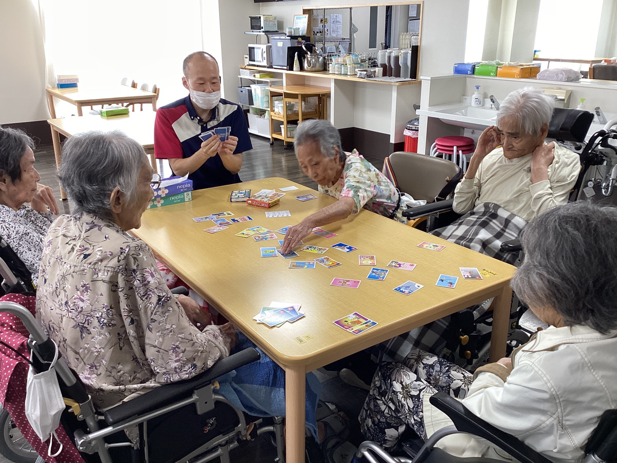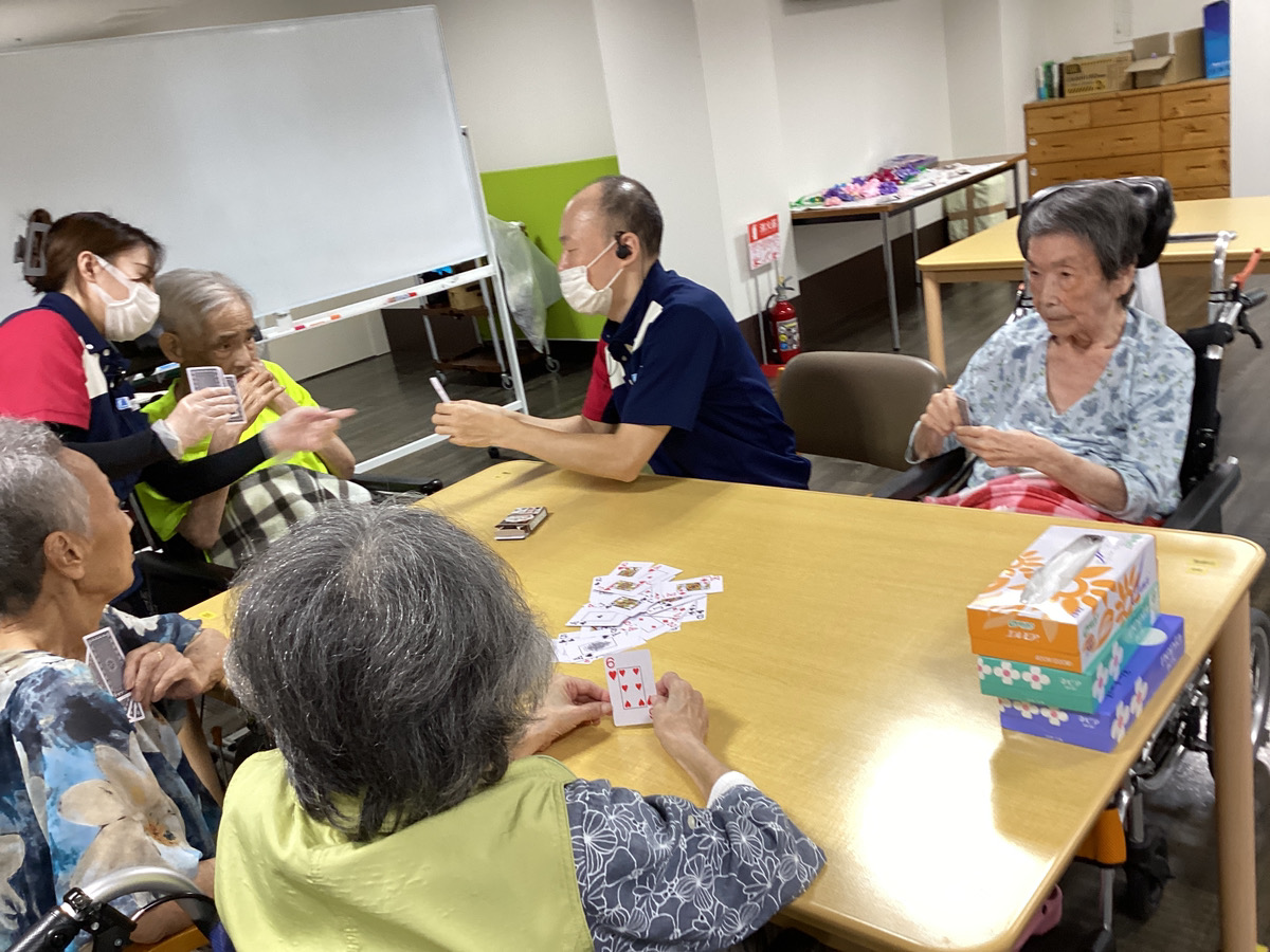 こんにちは、ケア・パレス大阪です。 8月中旬に入りセミの勢いも増す季節ですね。 今回のレクリエーションでは、ババ抜きをしました✨ ババ抜きは皆さんから大人気のレクリエーションです。 どれにしようか悩んでいらっしゃいます(^_-)-☆ 一抜けです!!!! 両手を挙げて喜んでいらっしゃいます✨ 次もお楽しみに(...