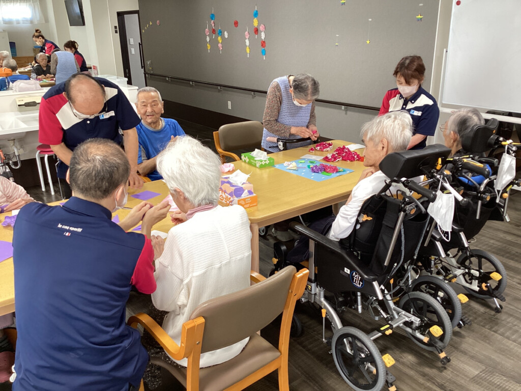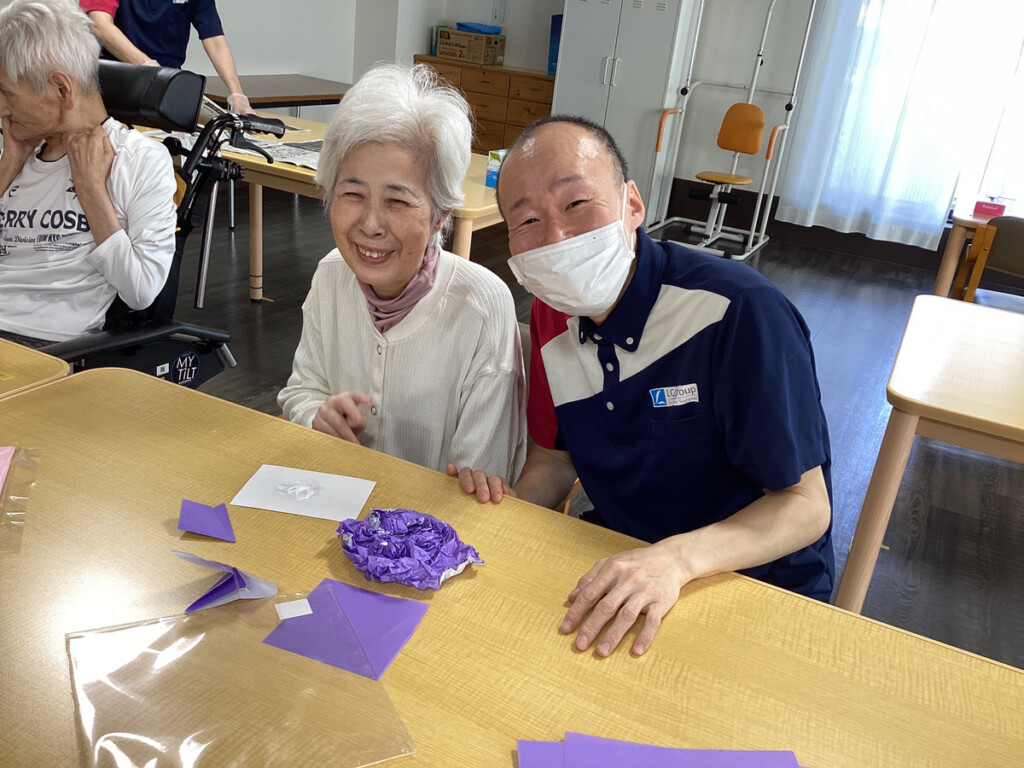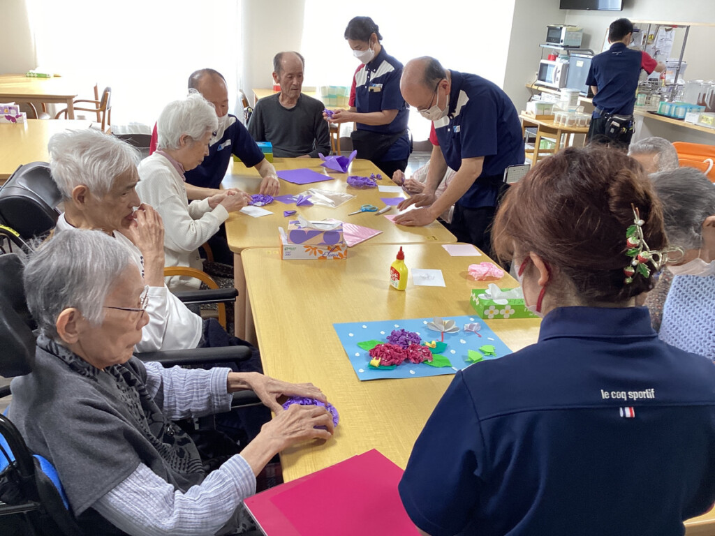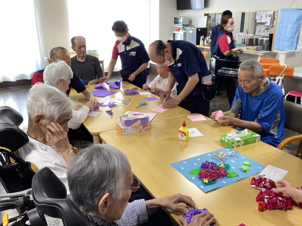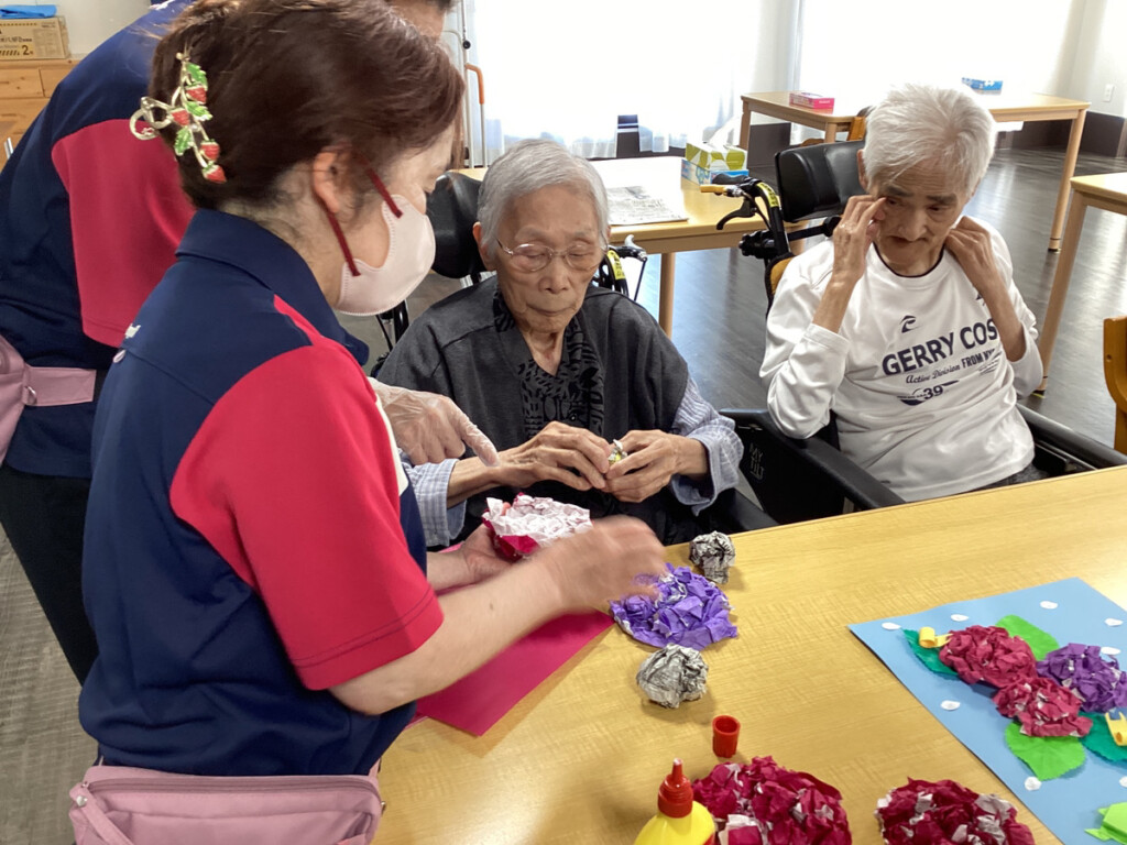 5月も下旬にさしかかり、レクリエーションでは6月に向けて折り紙で紫陽花を作成し始めました♪